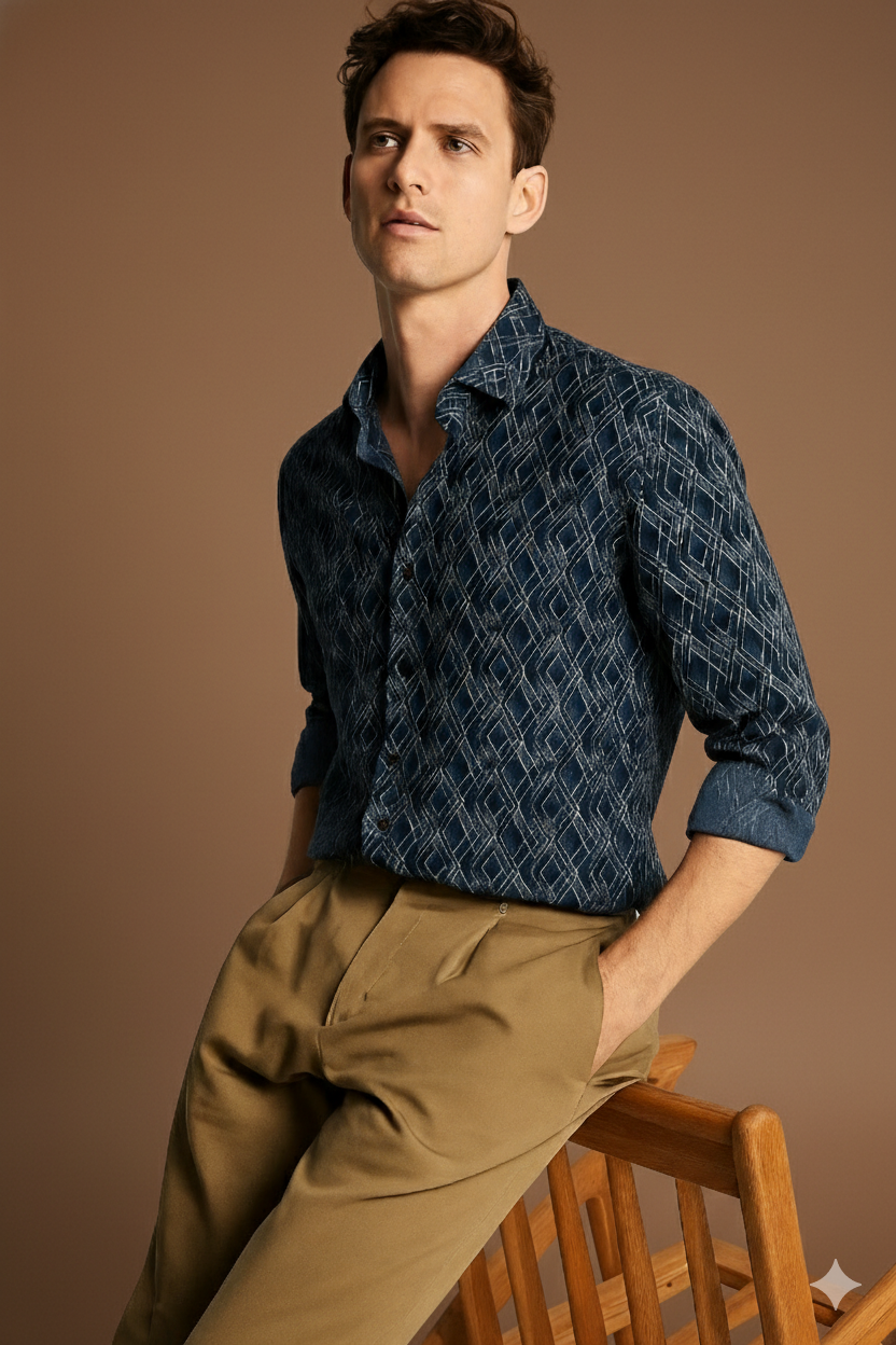 Men’s Satin Shirt with Criss-Cross Print with Regular Fit