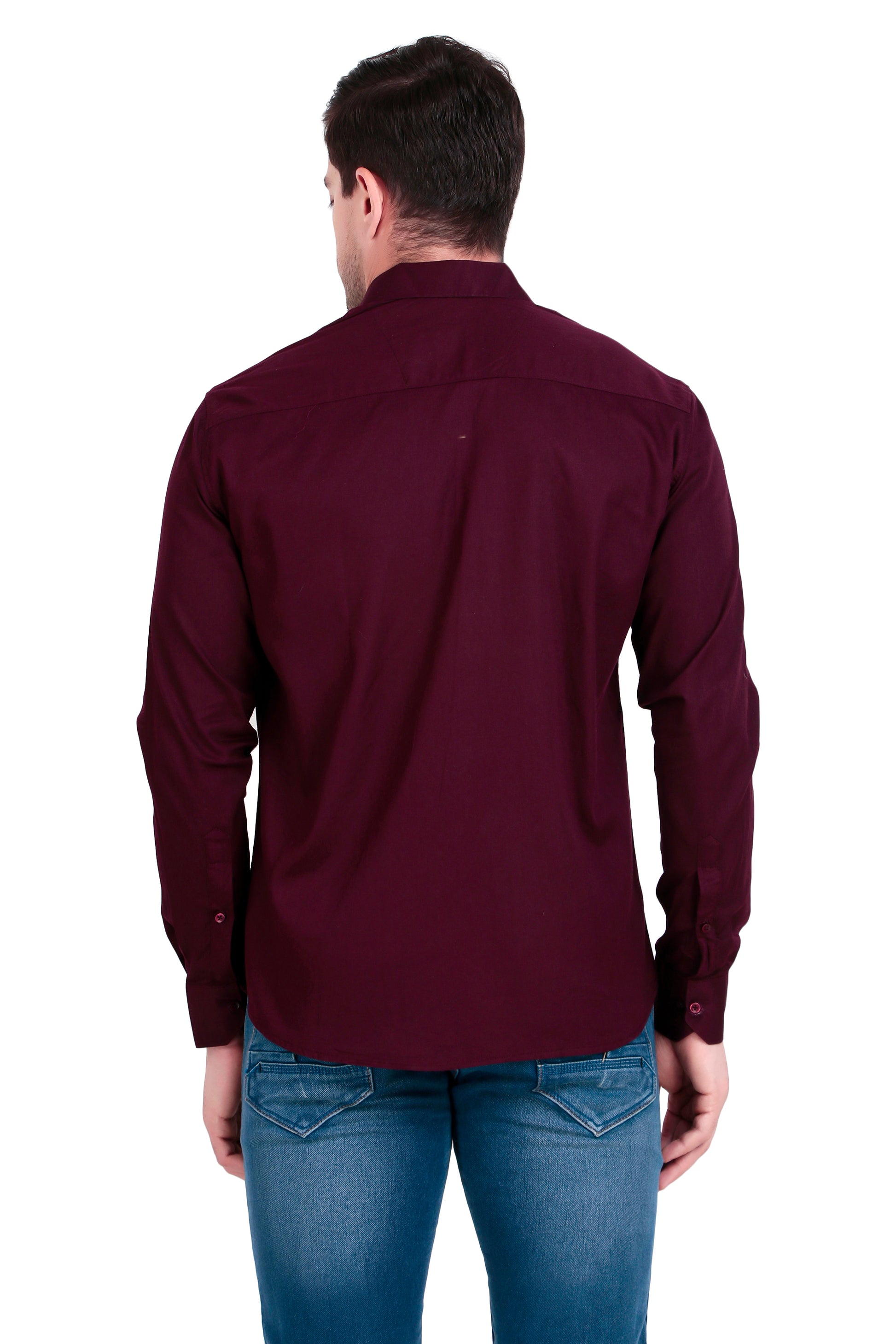 This men's shirt features premium satin lycra fabric in rich maroon color, offering light stretch and comfort with a sleek plain design perfect for casual and formal occasions.