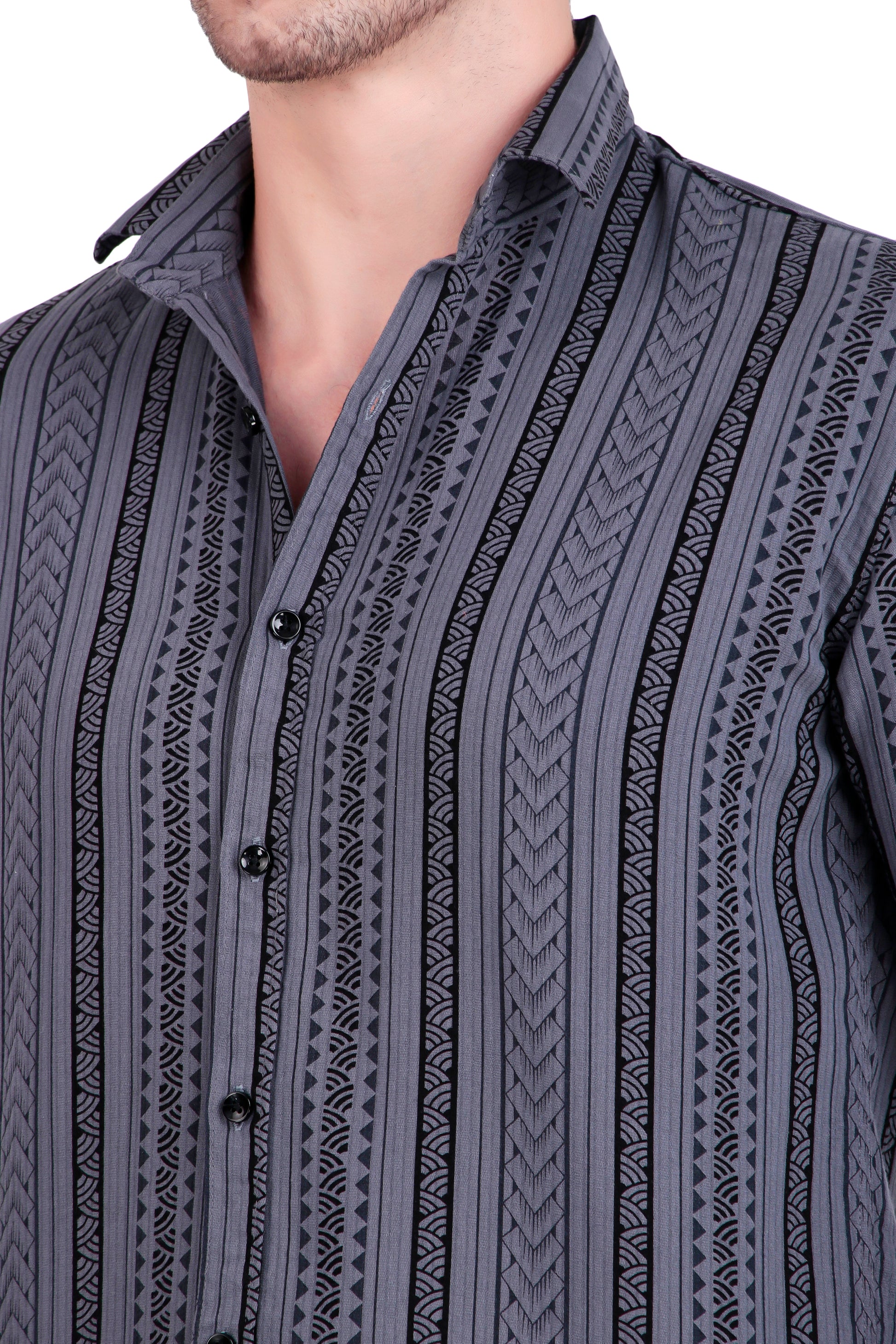 This men's shirt features premium 100% cotton fabric in classic Slate grey stripes with innovative detachable hoodie design, offering versatile styling options perfect for casual and semi-formal occasions.